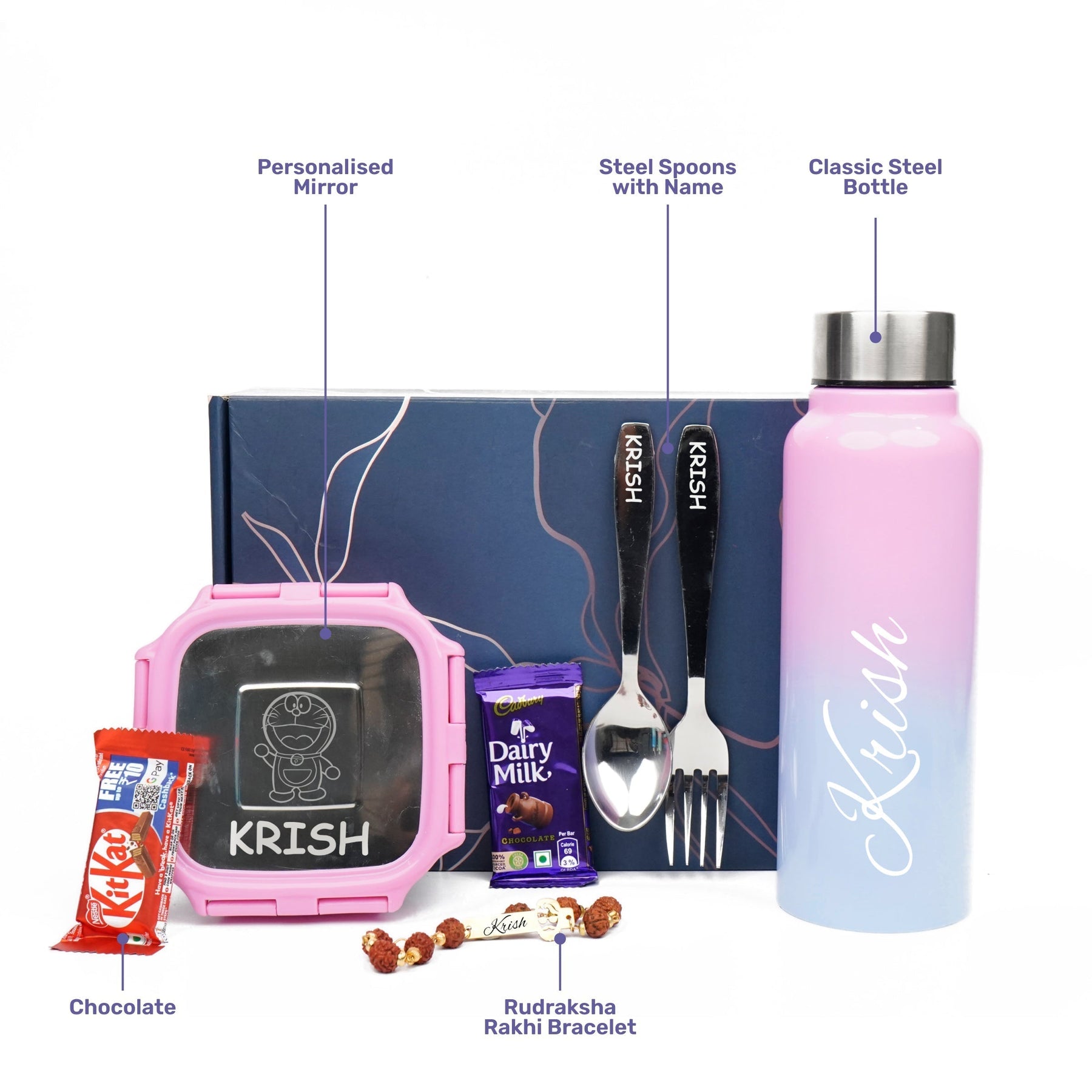 • Fun and Functional: It combines practical items like the tiffin box and water bottle with delicious treats and a traditional Rakhi.