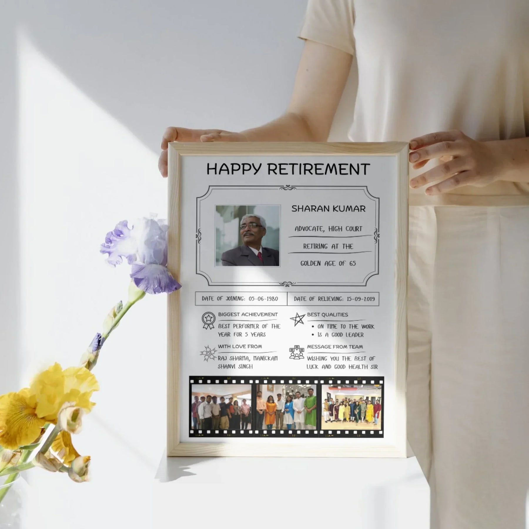 The "Personalized Retirement Memories Frame" is a heartfelt way to celebrate a retiree's career and accomplishments. Customizable with the retiree’s name, retirement date, and a meaningful message, this frame beautifully showcases cherished memories from their professional journey. Ideal as a retirement gift, it serves as a lasting tribute to years of hard work and dedication. Whether featuring a photo, special quote, or milestone moments, this frame makes for a thoughtful and personalized keepsake that will be treasured for years to come. Celebrate their new chapter with this unique and sentimental gift.
