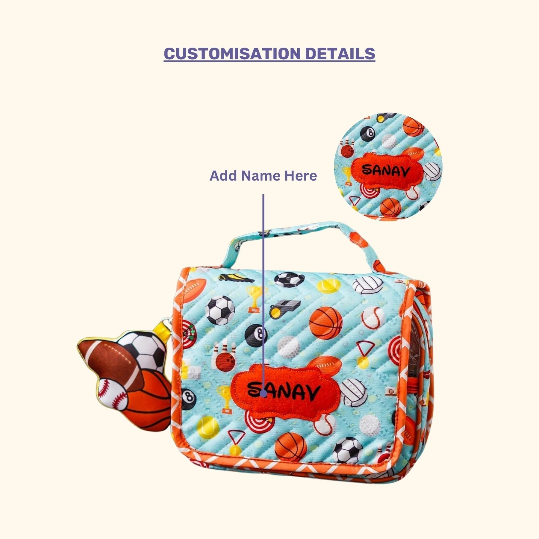 The Sports-Themed Multipurpose Travel Kit for Kids is the perfect accessory for little sports enthusiasts! Designed with a fun sports print, this versatile travel kit helps keep your child's essentials organized. It features spacious compartments to store toiletries, snacks, and toys, making it perfect for trips, school, or daily outings. Lightweight, durable, and easy to carry, this kit adds a sporty and stylish touch to your child’s adventures while keeping everything in order. A must-have for active kids on the go!